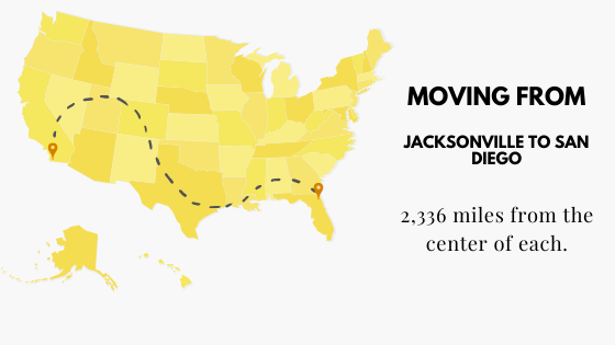 The average cost of moving from Florida to California is $4,249.10. However, moving expenses from Jacksonville to San Diego can vary greatly. In addition to distance, you'll need to consider the size of your home, the number of items being moved, and any add-ons such as packing and unpacking services.